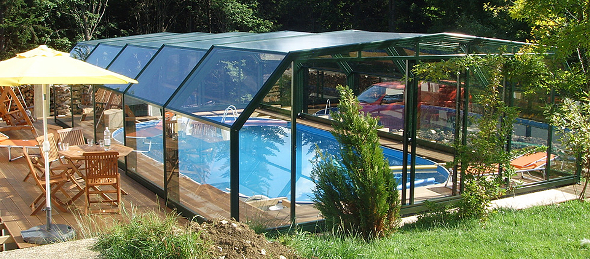 Dieses Modell bietet einen echten Ort der Entspannung zum Schutz vor der Kälte, dem Wind und dem Regen. Die Innenausstattung bietet einen freundlichen Raum, um die verbrachte Zeit in der Nähe des Schwimmbades zu verlängern. Sehr handlich und praktisch durch das Gleiten auf Rollen, kann die Überdachung leicht auf- und zugemacht werden. Auf Wunsch kann sie auch motorisiert sein.